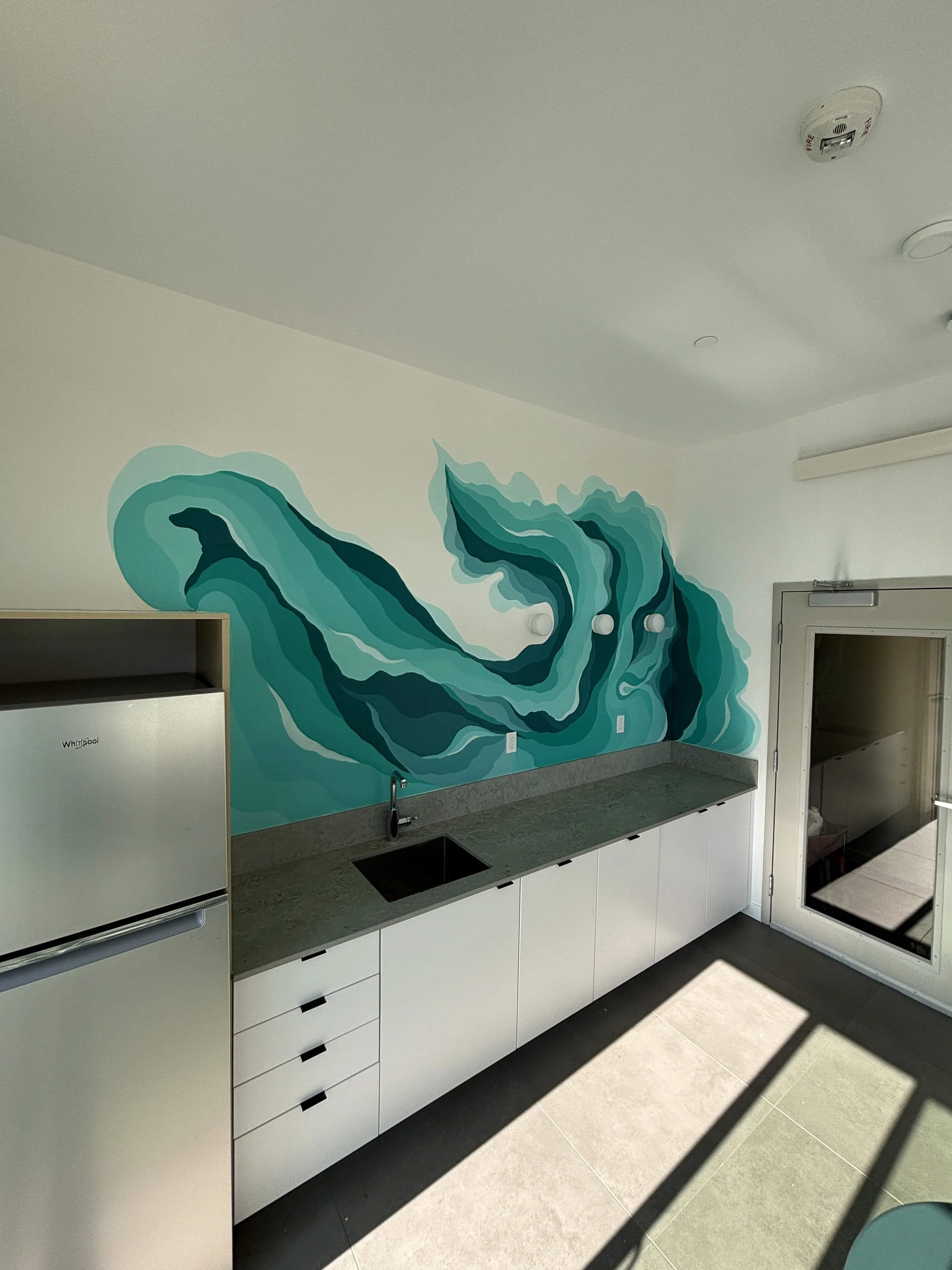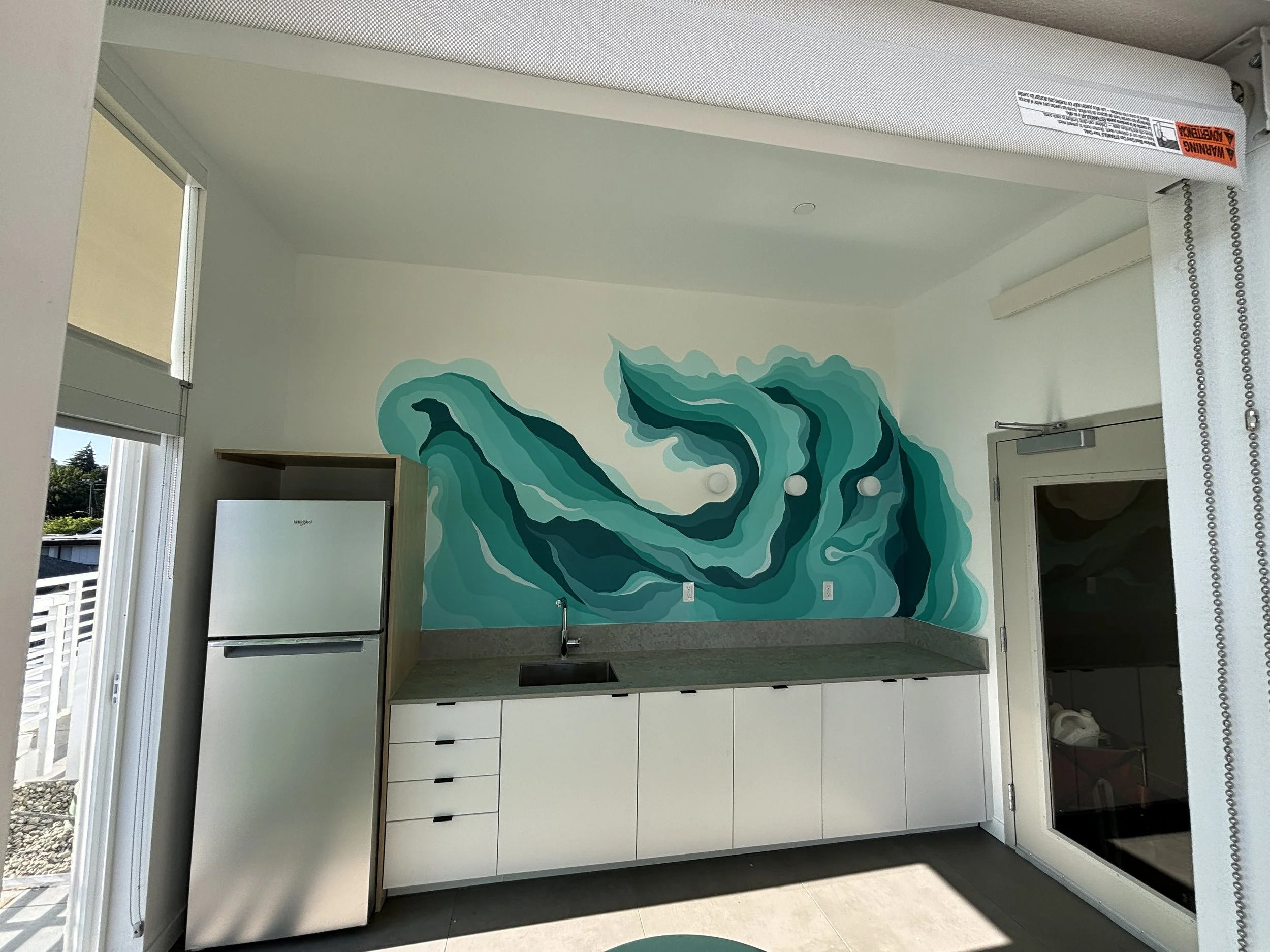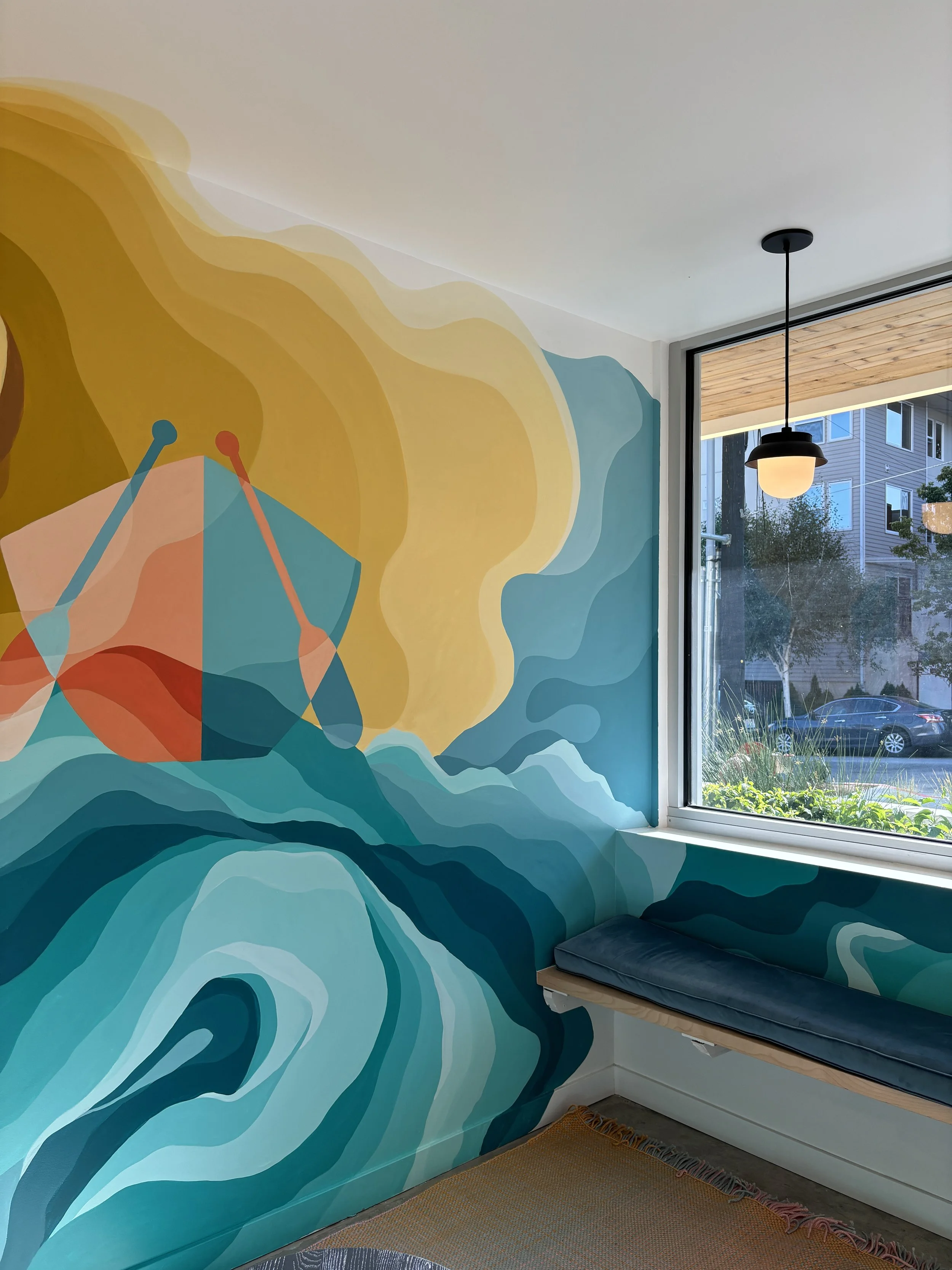 Open Waters Murals Client: Rowlock Apartments 2024 Freemont, WAMaterials: Acrylic PaintLobby:Top Floor: