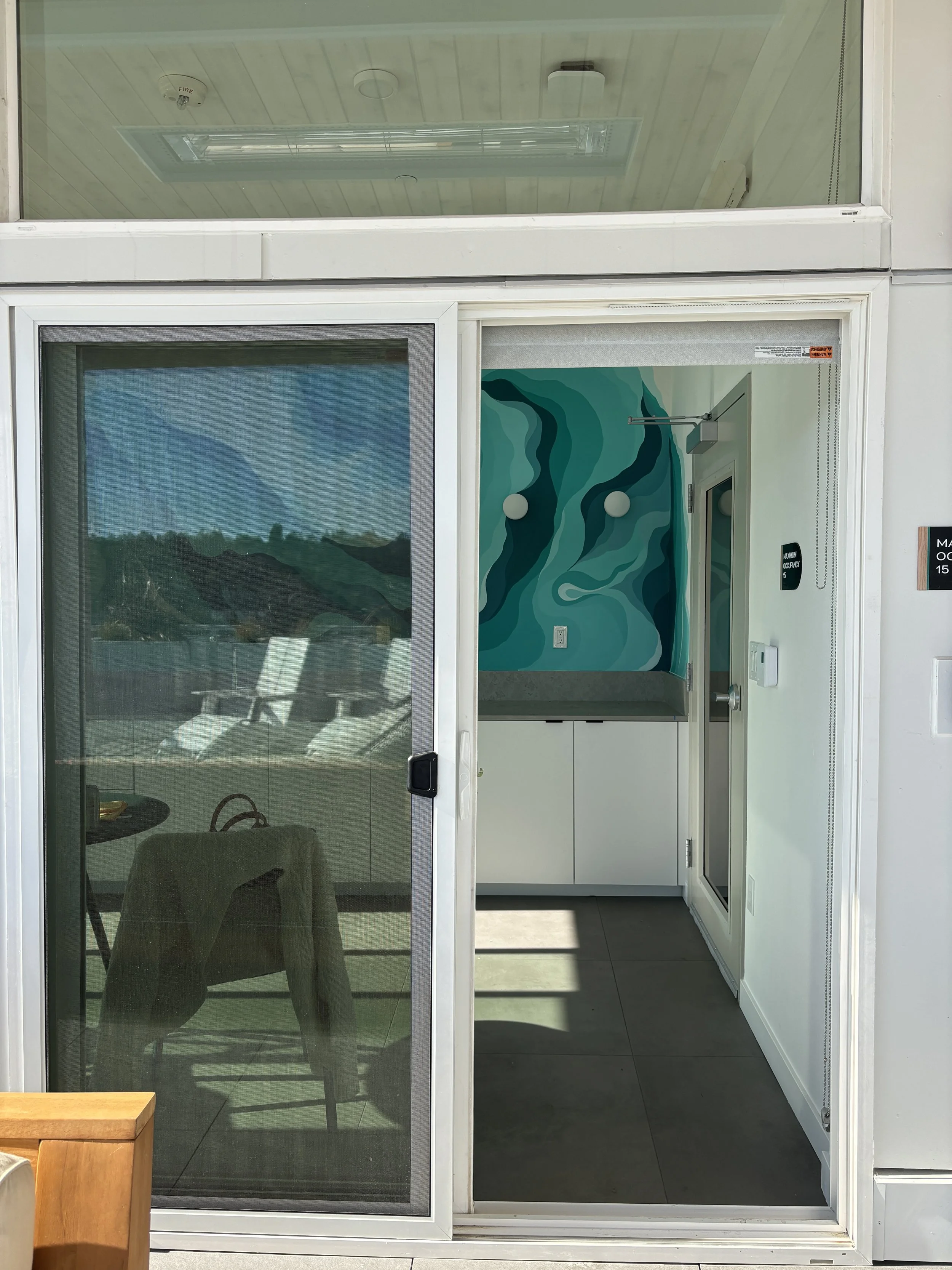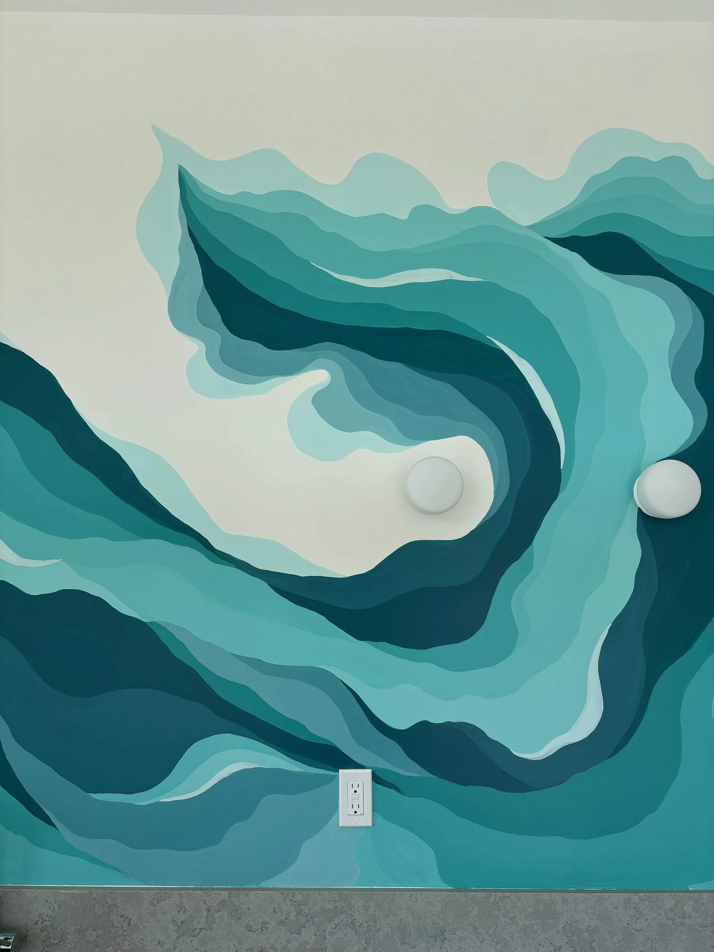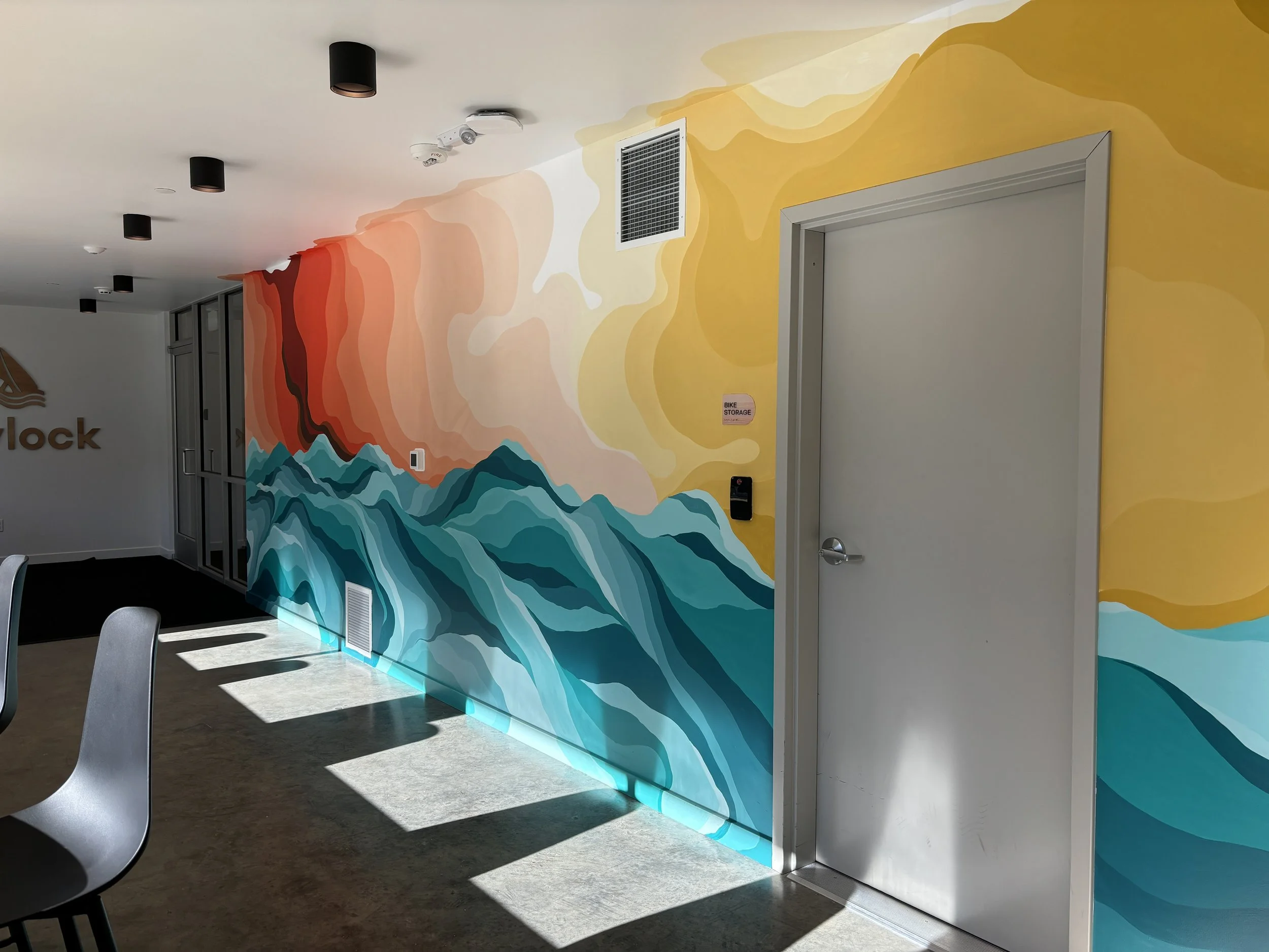 Open Waters Murals Client: Rowlock Apartments 2024 Freemont, WAMaterials: Acrylic PaintLobby:Top Floor: